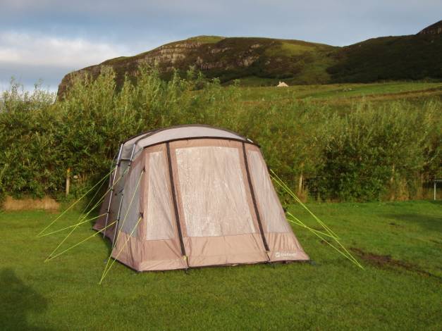 Our Uig campsite suffered from being far too wet. Cars could not be put next to tents and this led to a crowded look up the central track, but the tents had their own isolation. And after a night of rain, the morning greeted us with some glimpses of sunshine – so here’s the tent with the early brightness on it – and not a car in sight.