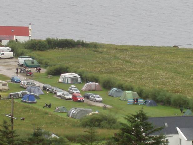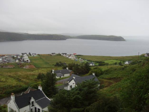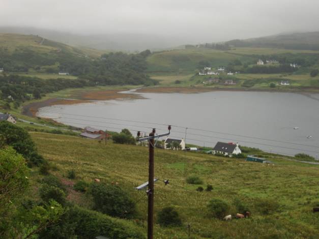 Rain returned and we delayed our departure for a while before taking the road north out of Uig – north and upwards so we were able to take a view down on the campsite.