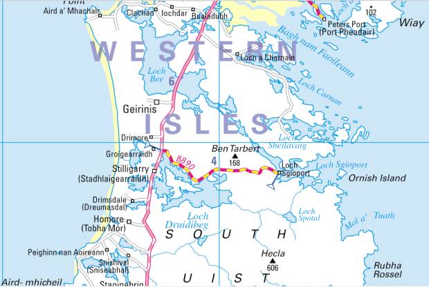 We headed away from delightful Daliburgh up the main road of South Uist. We passed the turn to Loch Eynort and then the one to Loch Skipport (in Gaelic on the map below as Sgioport). The map shows how close things are to Loch Skipport and its associated waterways and then Loch Bee actually cutting South Uist in to two parts. There’s about a tracks width of land at the northwestern end of that waterway to separate it from the sea.