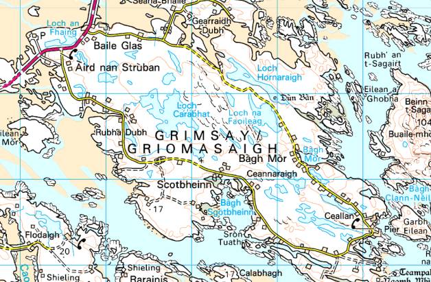 Part way across the sandy area, the road makes use of a corner of the isle of Grimsay.