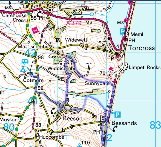 No, we didn’t walk from Beeson to Widecombe in the Moor where Tom Pearce was persuaded to lend people his grey Mare. Our Widdicombe was the cause of our devious route to the coast for it was the grand house and farm that didn’t allow walkers to use the drive – which, when all is said and done, is not a public footpath.