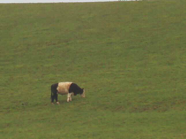 That’s our car at what might be a tidal point but the mud was firm enough to get off the road and take a little walk as the weather had now improved. And what is that black and white animal up the hill?